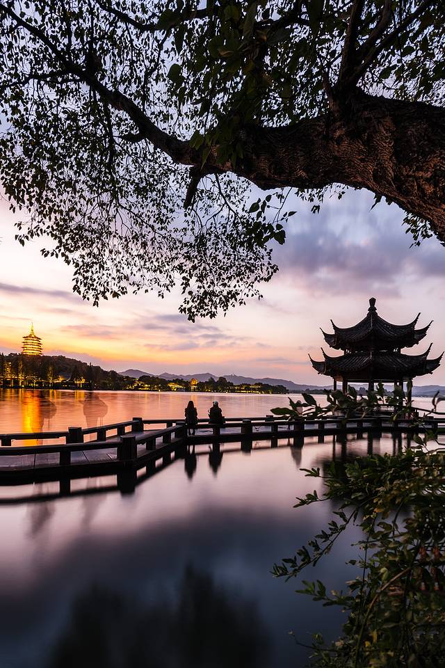 柳浪闻莺公园内的一个亭子,面向西湖,视野开阔,是慢慢欣赏风景的好地方。而这里也是摄影师最爱的景点机位,亭边对称的四个小石台,一度成为杭州的风景名片