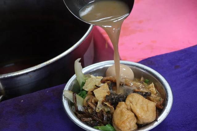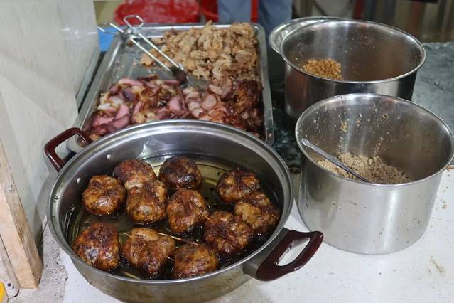 滤粉的配料和螺蛳粉有些区别,有碎肉、叉烧、烧肠、爽口和烧遮等选择。前三项很好理解,“爽口”类似于火锅店吃的炸小酥肉的口感,外面裹了一层面包糠;“烧遮”类似于我们平时吃的红烧狮子头,里面会有猪肉末、葱花、香菇、马蹄等食材,团成圆形,用牙签固定后油炸至金黄出锅。