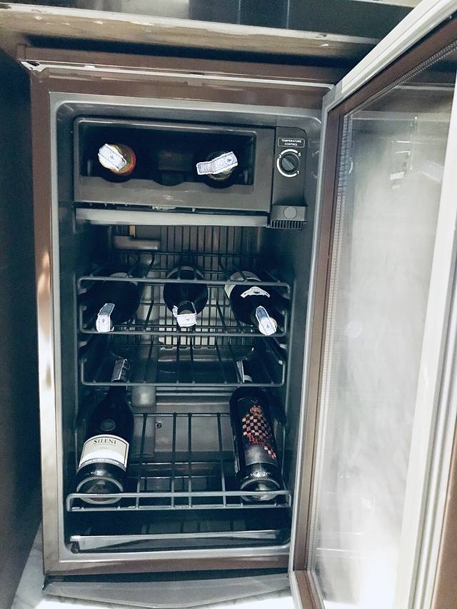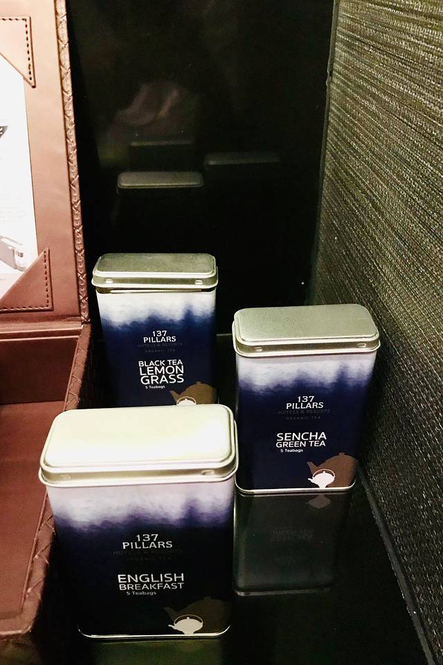 进门右边是酒店单独辟开的一间带私人酒窖的承担mini bar功能的超大房间,且不提冰箱、胶囊咖啡机、红酒柜及定制泰式小零食等常见不常见用品一应俱全,以往在星级酒店迷你吧里以袋计算的茶包在这儿直接变成了137定制款的三罐!进门左边的曲折角落则被巧妙的安排成一个客用卫生间,真 · 空间大师。