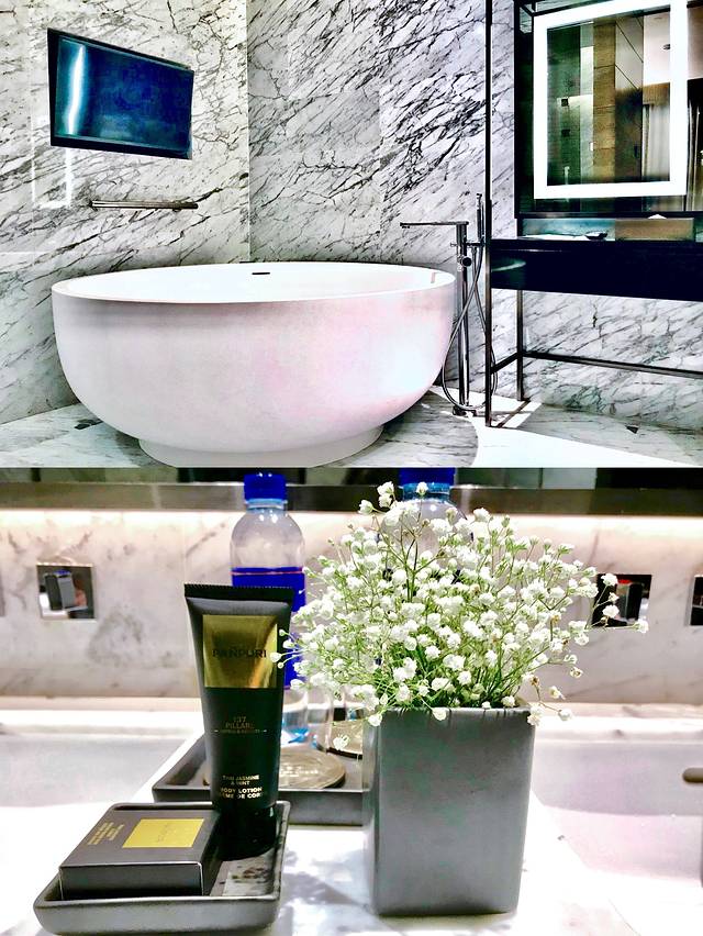 夜晚在大浴缸泡澡,用泰国奢华香薰品牌Panpuri洗浴备品舒缓安神,浴室和衣帽间的定制款时尚皮制化妆包和编织随身包,让我们感受到酒店对于提供高品质旅居的诚意。