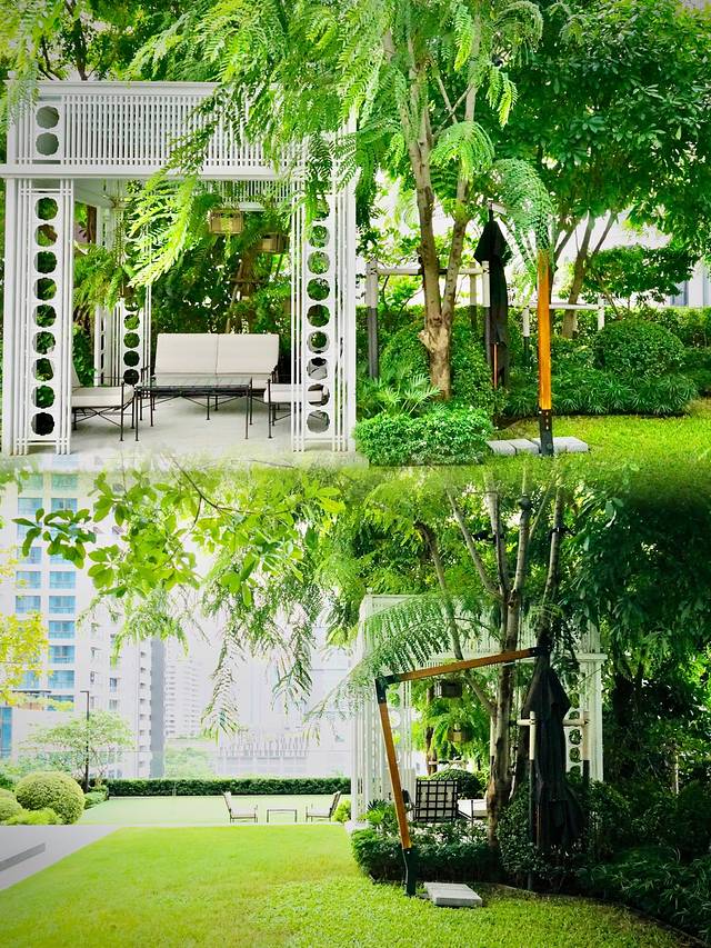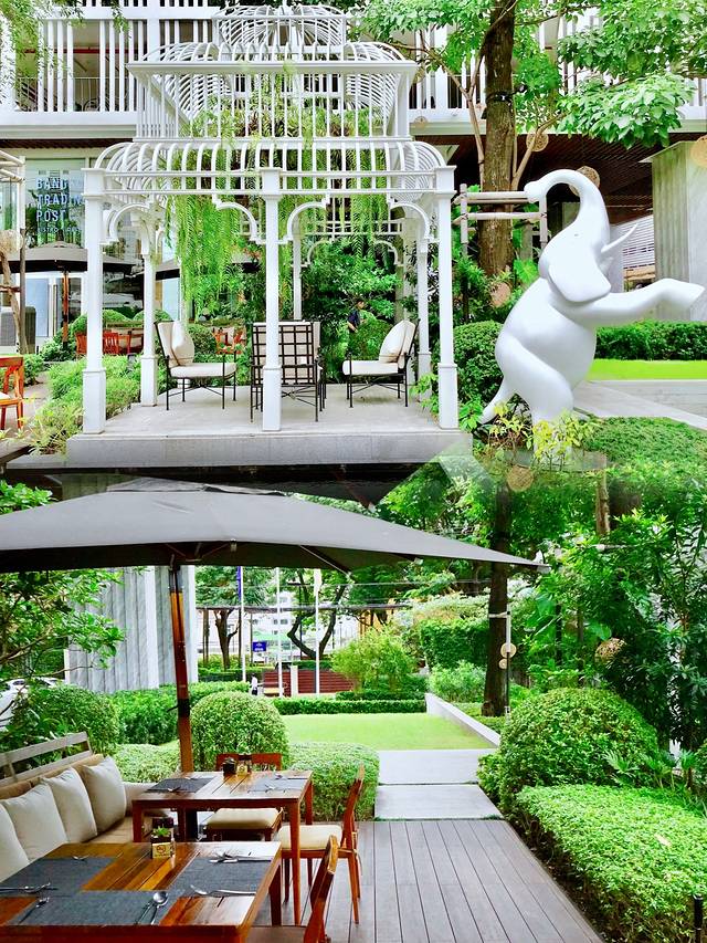 其配套的户外小庭院清新自然,鸟笼状小凉亭、佛国代表的象雕和露天用餐桌椅组成的白绿清爽配色精致园林,无疑乃INS风取景好去处。