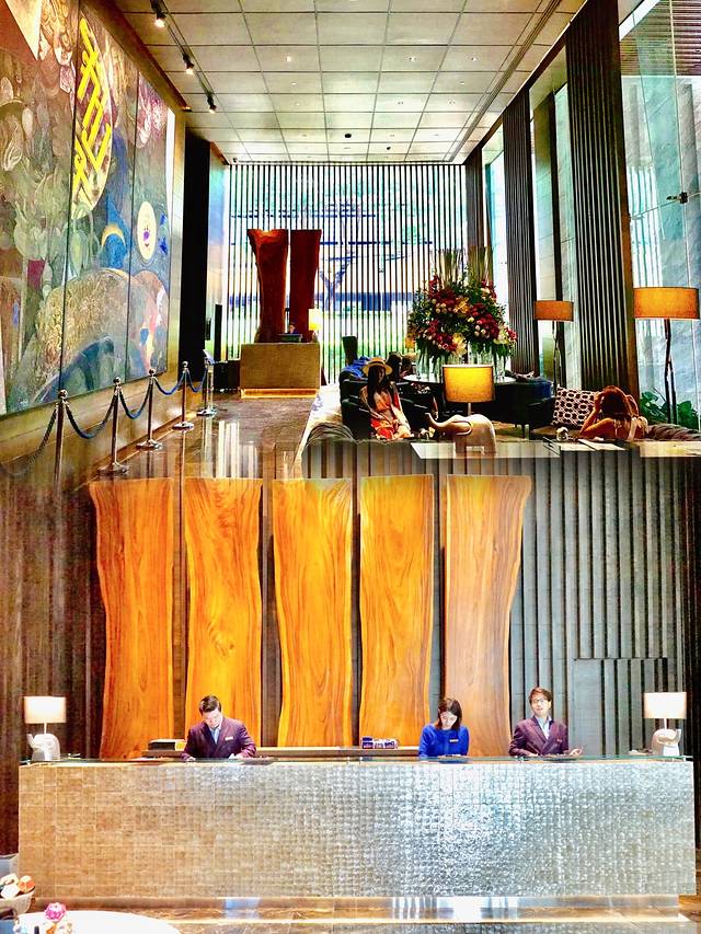 步入大堂, 深褐黑胡桃木的主基调充溢全空间,墙上出自本土当代知名艺术家Panya Vijinthanasarn之手的巨幅“好运之路”主题浓郁泰风壁画悄然夺目,而前台及礼宾处带自然纹理的几块巨型柚木原木,造型天然,不仅自带设计感,更是对其传承原作的清迈137柚木老宅的致意。