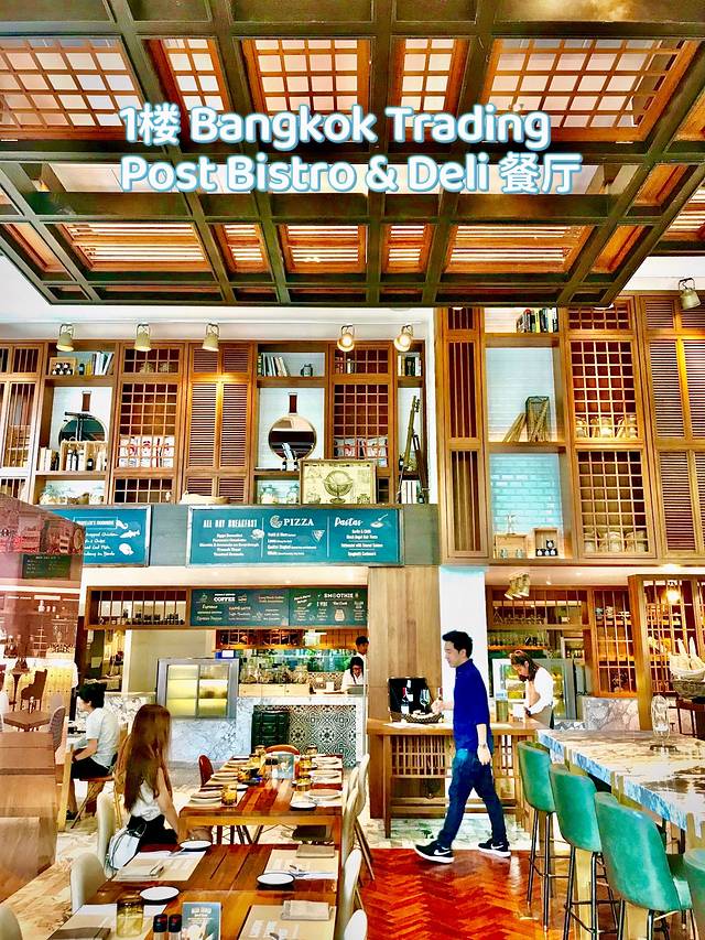 酒店一楼入口由Santhaya & Associates公司设计的【Bangkok Trading Post Bistro & Deli】餐厅,供应手工面包、咖啡等传统西式及泰式精致小食等简餐,近6米的层高, 三面落地窗及自然光线的充分引入,让全空间开阔明亮得毫不费力。