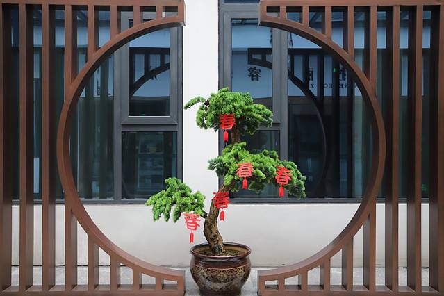 酒店的结构类似于中式庭院一样,中间是镂空的,种的有花草,还有小盆栽,看着 很放松心情