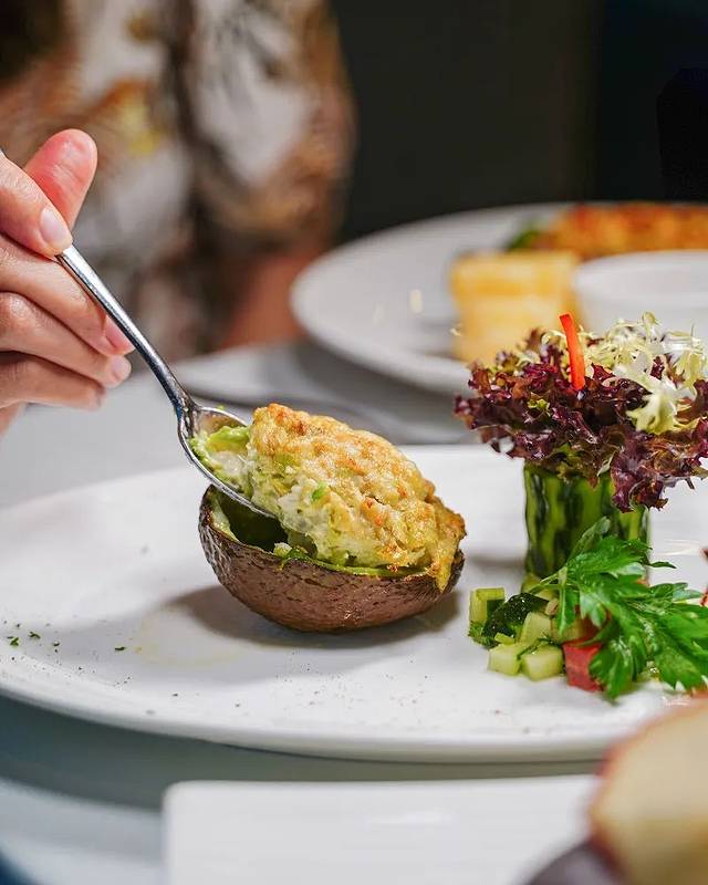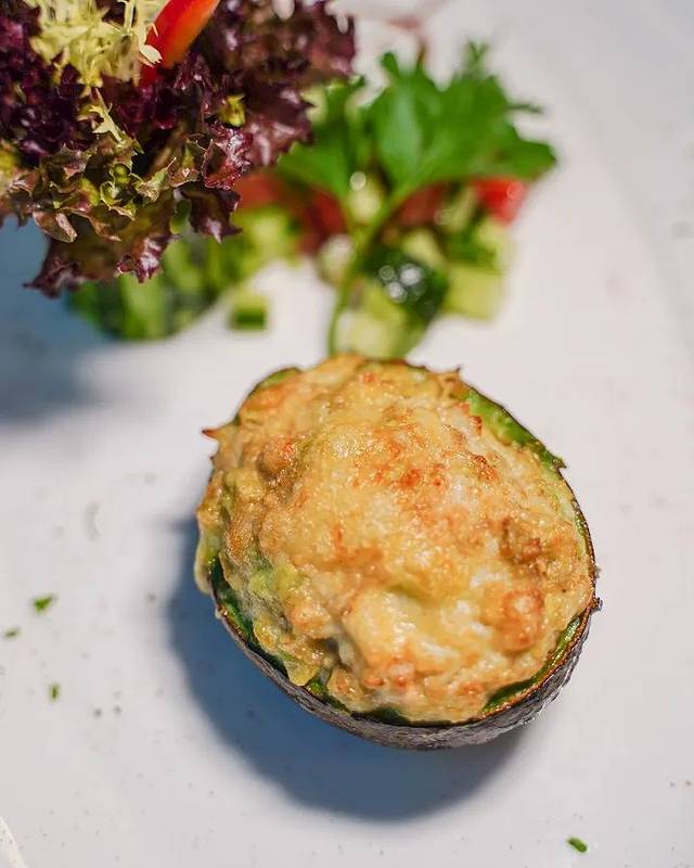 前菜由「芝士焗蟹肉拼牛油果」打头阵,一丝丝的蟹肉与芝士一起焗香,再搭配牛油果软糯的口感,这个组合可以说是十分有惊喜,另外还可涂抹在面包上吃的喔!