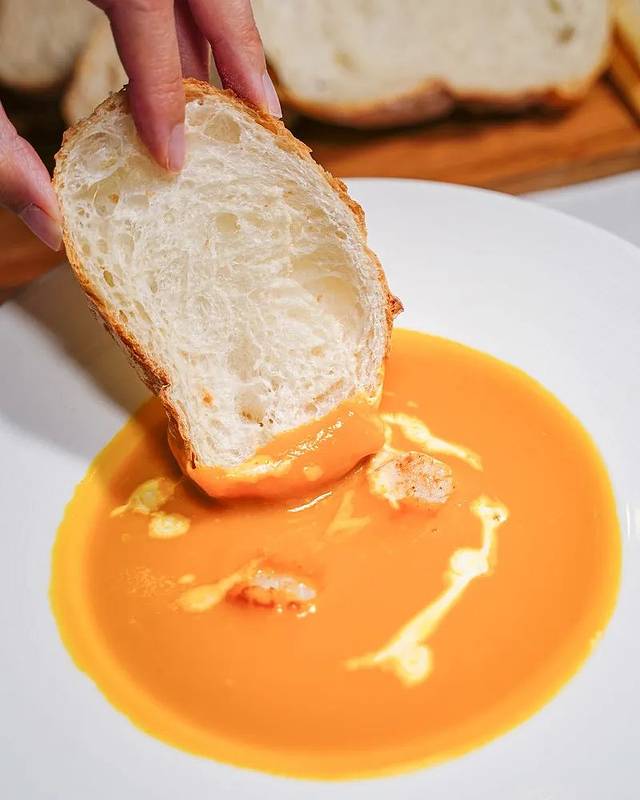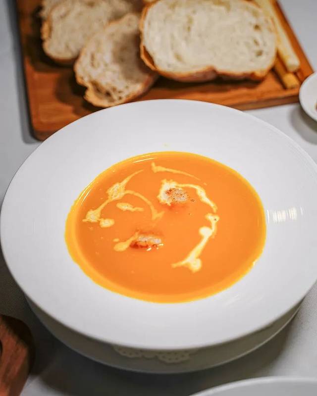 这款南瓜汤煮得很creamy,入口香滑浓郁,完全没有草青味,反而将南瓜的甜味带出,配上带子喝起来不会太腻。将餐前面包沾点汤汁吃,也有一番风味哦~