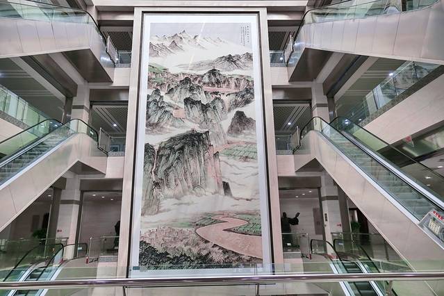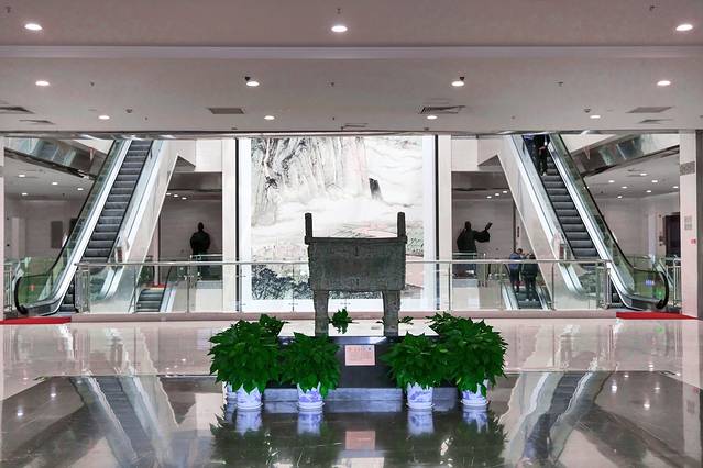 入馆需携带身份证,通过安检后,巨大的山水画“黄河从高原雪山走来”映入眼帘,从一楼耸立至四楼,相当壮阔。展厅的正中央是“后母戊鼎”的复制品。反应了古代黄河流域青铜工艺的精湛技艺。