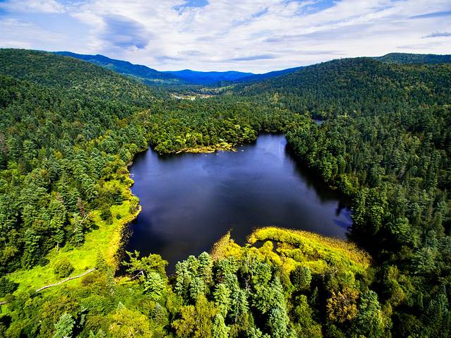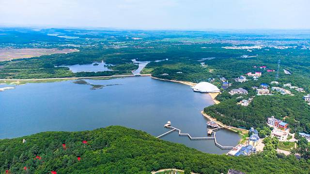 火山口国家森林公园:距离镜泊湖50公里左右;形成于距今一万多年前,火山喷发形成的12个直径大小不等的火山口及岩浆流淌形成的地下溶洞群,经数千年沧桑变化,在原始裸地形成阔叶红松原始森林。火山口森林公园集湖光山色、火山地质、自然风光于一体,上帝视角就像一颗镶钻的碧玺,非常美丽。