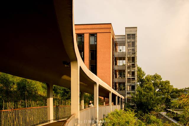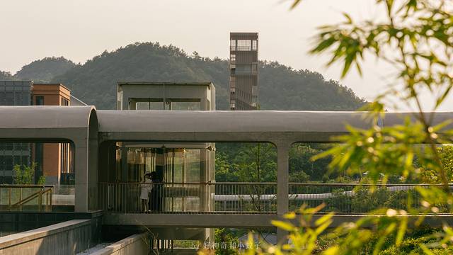 整个中心融合在山、湖、古村落中,几幢别具风韵的新建筑矗立在半山腰上。红砖立面、水波纹的拱顶有设计感也有年代感。其中设计研发楼、学术综合楼分立东西两端,由曲折蜿蜒的景观连廊相连,做到了风景与底蕴并存。