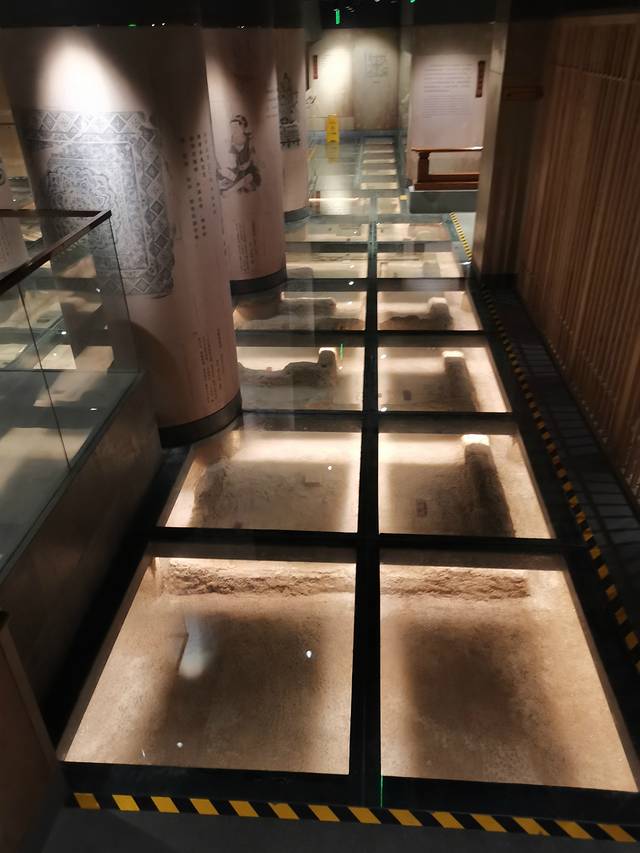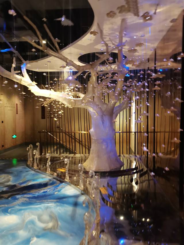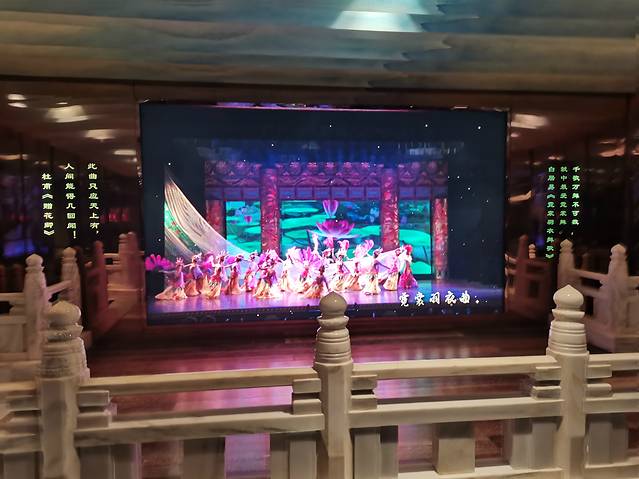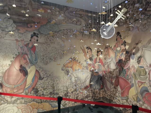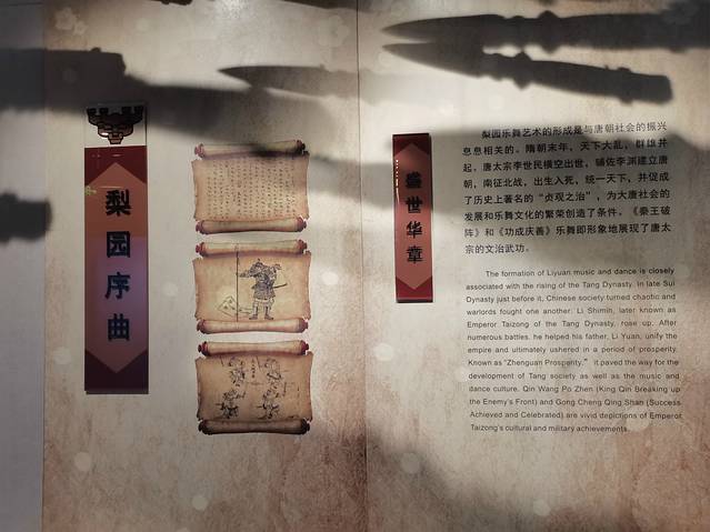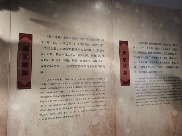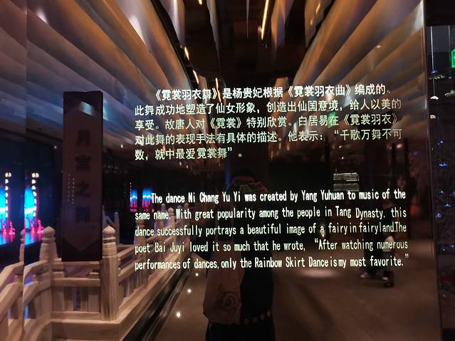 在进入博物馆大门后,迎面看到的是一片蓝色的靓丽星辰,仿佛时光倒流,一下子又回到了那一千多年的大唐盛世时代。在旁边的展板上有唐代初期的乐舞发展历史,如唐太宗李世民时期的《秦王破阵》和《功成庆善》乐舞。接下来展示了著名的《霓裳羽衣曲》视频,《霓裳羽衣曲》又称霓裳羽衣舞,是一种唐代的宫廷乐舞,唐玄宗作曲。其来历有三种说法:第一种是说玄宗登三乡驿,望见女儿山(传说中的仙山),触发灵感而作。第二种说法则是根据史籍《唐会要》记载:天宝十三年(公元754年),唐玄宗以太常刻石方式,更改了一些西域传入的乐曲,此曲就是根据《婆罗门曲》改编。第三种则折衷前两种说法,认为此曲前部分是玄宗望见女儿山后悠然神往,回宫后根据幻想而作。后部分则是玄宗吸收了河西节度使杨敬述进献的印度《婆罗门曲》的音调而成。