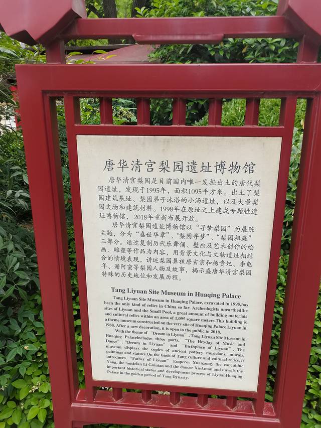 1994年1月,华清池管理处在维修会议室时,偶然间在地下发现了一组比较完整的唐院落建筑遗址和一座汤池遗址。后经考古专家系统考察和论证,同时根据华清宫所遗留下来的唐宋史志资料和图录所记载,确定这里就是唐代华清宫梨园遗址,也是当年梨园弟子们住宿、沐浴、演练歌舞的地方。1998年在原址之上建成了专题性遗址博物馆,2018年重新布展开放。也是全国首座梨园文化专题博物馆。这里以“寻梦梨园”为展陈主题,由“盛世华章”、“梨园寻梦”、“梨园祖庭”三部分构成,又分为了小汤遗址、梨园模型、梨园文物、梨园乐舞和梨园鼻祖五部分组成。