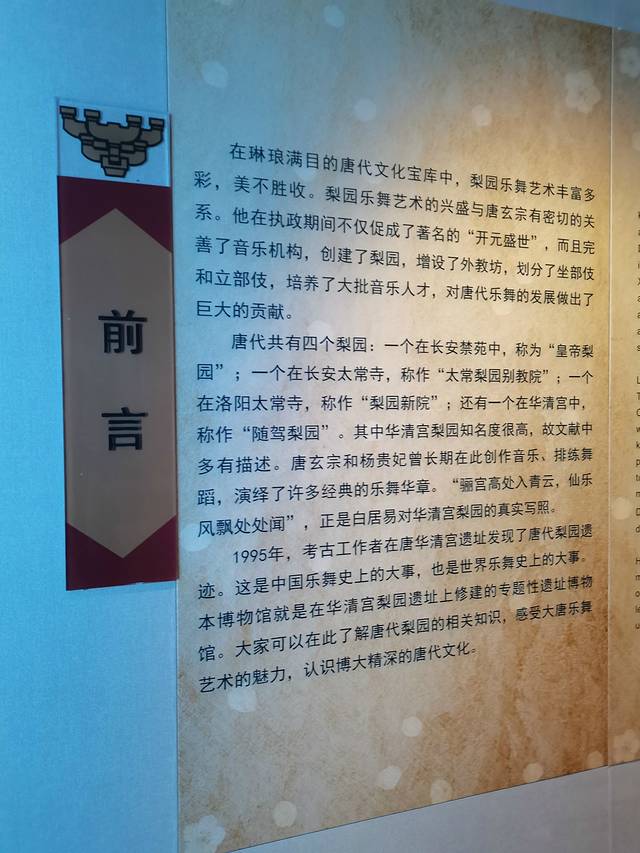博物馆外观为两层,上有“梨园祖庭”四个大字。梨园,顾名思义是栽植梨树的果园。是唐玄宗和杨贵妃在大唐宫廷内设置的。专门安置管理梨园弟子与教习乐舞的机构。始建于开元11年(公元723年),是迄今为止我国唯一一处发掘出土的唐代梨园遗址,据史书记载,在华清宫东缭墙附近设有按歌台,每年的秋天时节,梨园弟子们常常随着唐明皇来到华清宫在这里表演歌舞,所以华清宫梨园也叫随驾梨园。