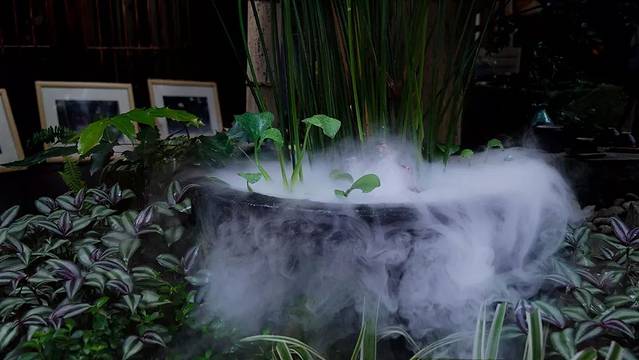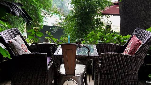 院中有几处椅凳,三五好友相聚于此,绿植间饮茶谈笑想必十分惬意悠然。只是有一点不好,院中蚊子偏毒,所以主人在每个桌上放置驱蚊花露水,桌下点驱蚊香。