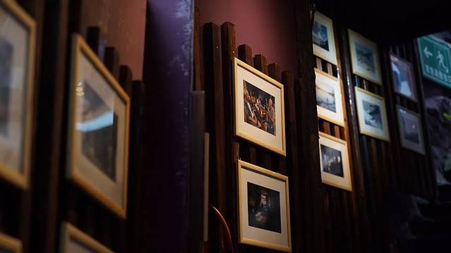 由几级阶梯下到小巷中,两侧的墙上所挂的照片便让我心情欢喜,照片拍的都是老重庆的样子,在昏黄灯光的映照下真的很有感触