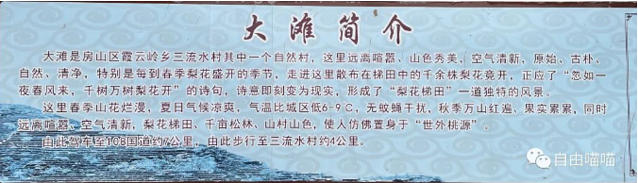 住宿:大滩村里有农家院可以住宿但是条件不是特别好,还是那种农村旱厕,条件实在是很接地气。村子不大,一天转完没问题,这里的特色就是春天的梨花了。