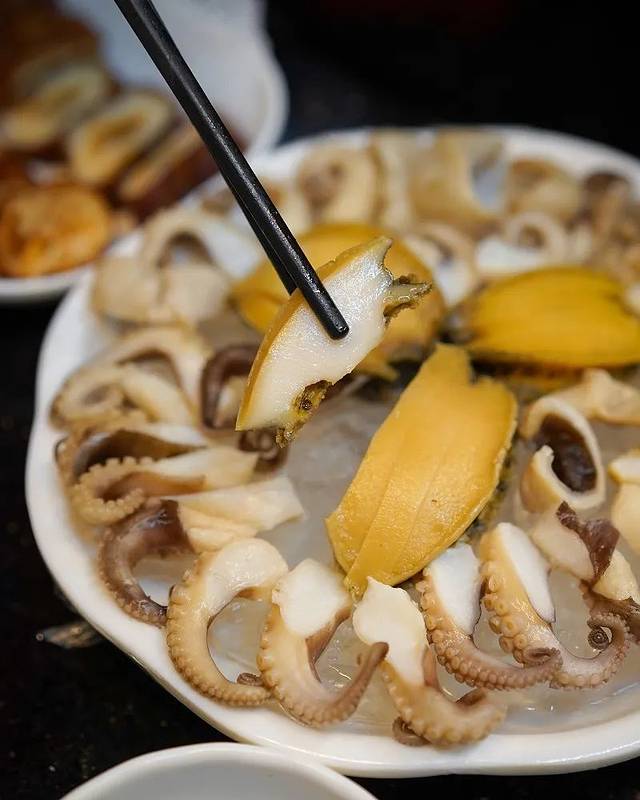 这道冷盘也是店内的人气之选,新鲜的八爪鱼和小鲍鱼切件摆放得整整齐齐。食材都是老板煮之前放了一些药材去腌制,而药材除了去除腥味,更能让这些海鲜的鲜味散发出来。
