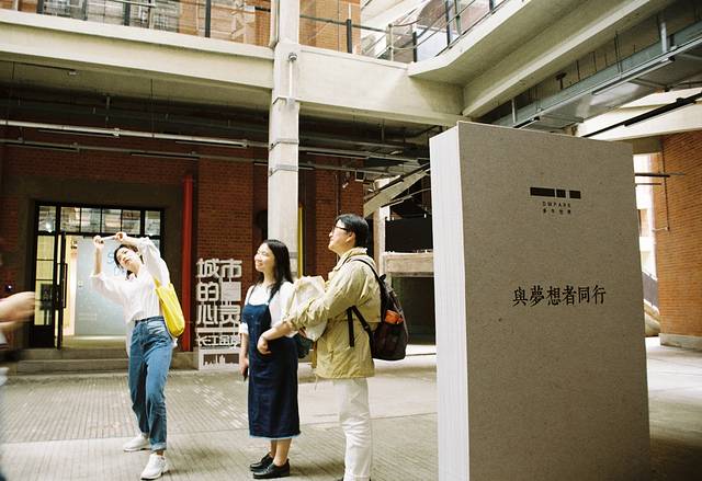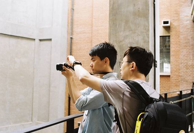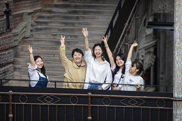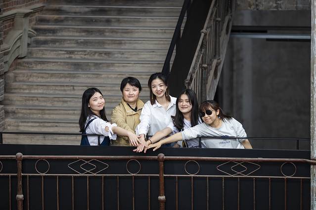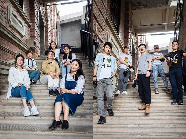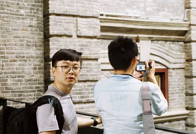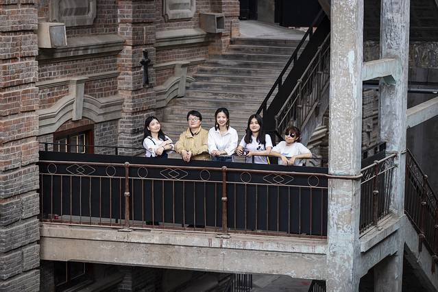 四层砖混结构建筑用红砖砌筑,窗间用壁柱分割,窗下方装饰灰色水泥拉毛墙面。整体建筑光滑平整,朴实耐用,是典型的近代工厂建筑。搁这儿我们有一次开启了快乐的合影时间: