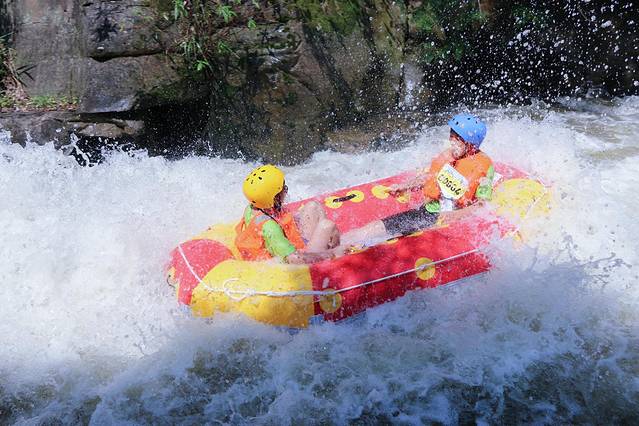 而且漂流河道分为上下段,上半段被称为“勇士漂流”,挑战刺激,玩出心跳,跌宕起伏间耳旁尖叫声不断,在穿山越水之中体验重庆回旋激荡的独特风貌。下半段是亲子漂流,地势平坦,河道两旁覆盖着竹林,郁郁葱葱,遮阴解暑。在这里,大人们可以带着自己的孩子打水仗,其乐融融,欢声笑语,尽享天伦之乐。