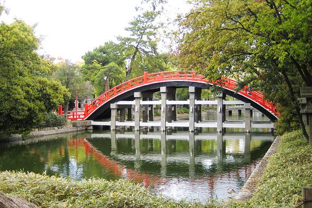 随手一拍就是一幅画,但最佳看点还是宛如太鼓鼓身一般呈圆拱型的“太鼓桥(反桥)”。人们相信只要走过这座桥就能驱邪除厄,自古就是住吉大社的象征。诺贝尔文学奖获得者川端康成的作品中也描述过这座桥,池畔的文学碑上也刻有作品中的一段文字。