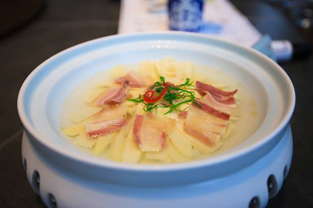 非常的有意思,这个汤是用茶壶装的,喝汤的时候倒入茶杯中再饮之。每一位客人吃的不仅仅是菜,还可品味唐代诗人在新昌留下的气韵与绝响。