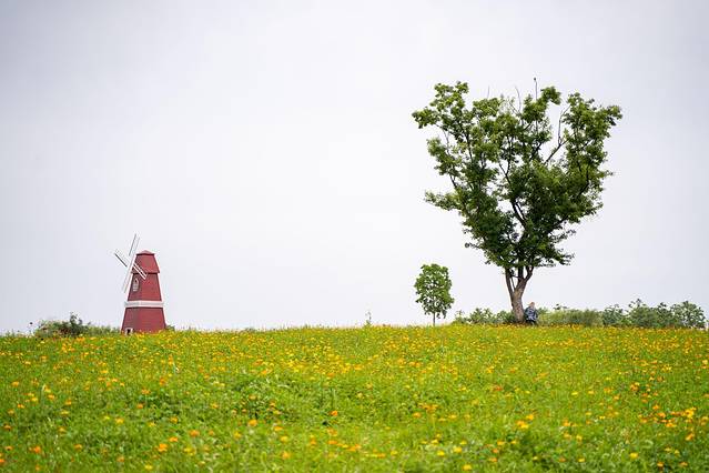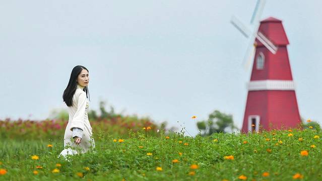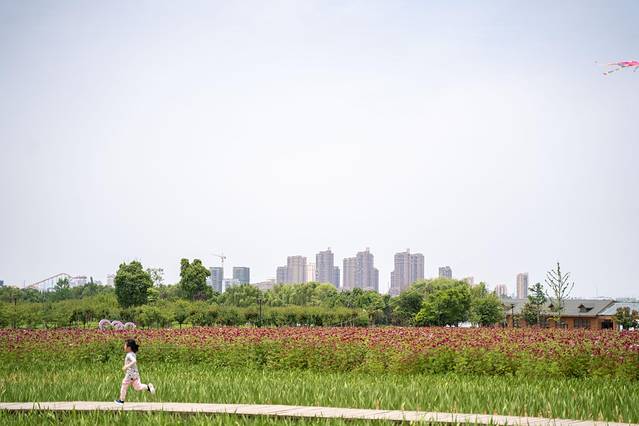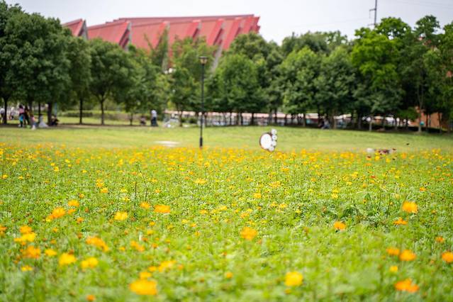 湿地公园的核心区域有一片开阔的小高地,地势平缓,满是绿茵,高地的中央是几棵粗壮适中的绿树,这几棵树便成了这一景点的点睛之作,在这个开阔的空地上开满了艳丽的波斯菊,踏青的市民络绎不绝,花香弥漫,处处风光、步步皆景,构成一幅巨大的生态画卷。