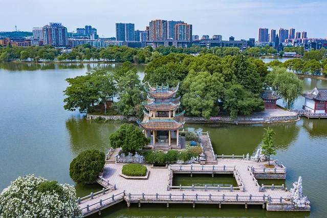 位于市区的天井湖就像一面古铜镜,静静地依偎在城市的臂弯里。