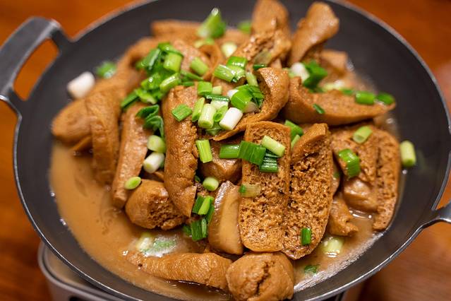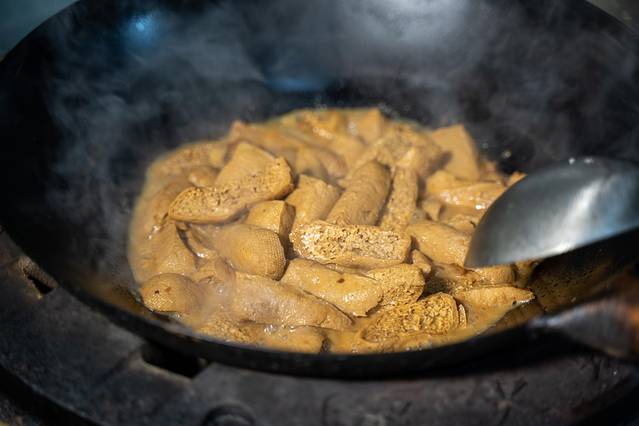 这里的“生付”指的就是豆腐泡,用豆腐泡去烧制当地的黑猪肉,使肉汁的香味都融入到了生付中,看着色泽滑嫩,吃着很爽口。