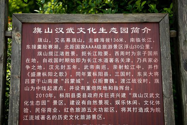 来到山顶,便是仿古建筑汉武阁,雪白的塔身和塔顶琉璃瓦熠熠发光。汉武阁是旗山汉武文化生态园主要标志,也是枞阳县的历史坐标。站在位于旗山主峰上的汉武阁里,远眺,“一城山色半城湖”的山水城市风貌尽收眼底。
