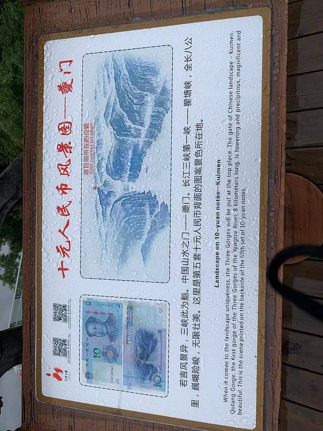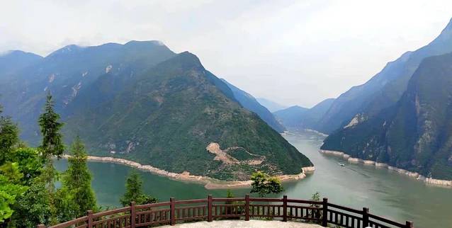 这是白帝城山上看夔门的最佳观景点,远处就是第五套人民币10元的背景,左侧最高处是山峡之巅,是山峡的最高点,海拔1388米。