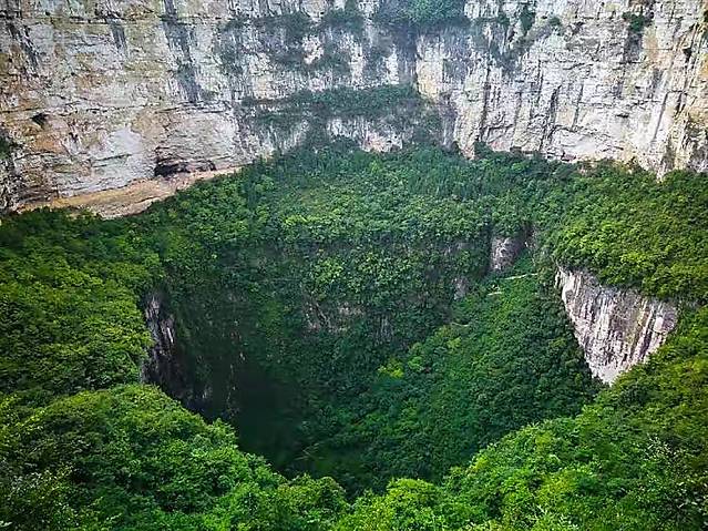 俯瞰小寨天坑,令人震撼,直径626米,深666米,世界第一,坑底向上望,就是坐井观天