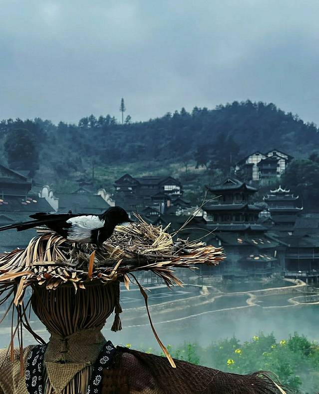 喜鹊在稻草人的帽子上休息,我想大概它是想和稻草人分享今天遇到的趣事吧