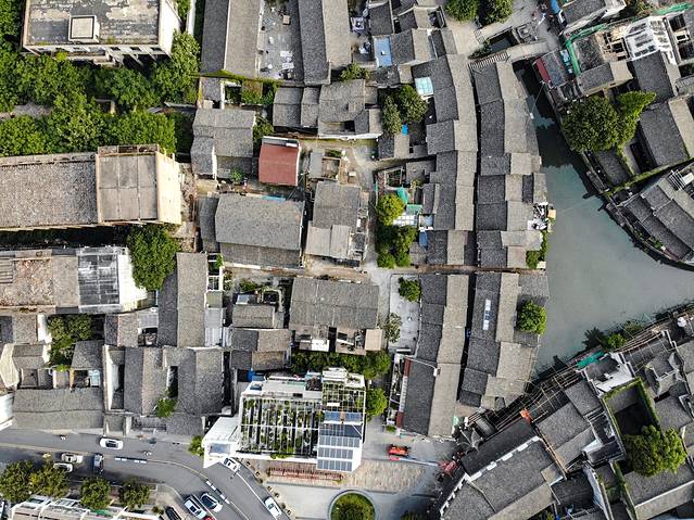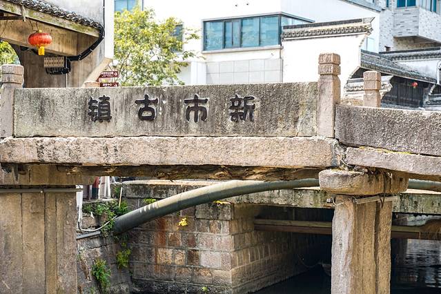 从停车场走到新市古镇的中心区域,会经过一个酿酒厂。高高的烟囱直耸入天,周围的空气弥漫着一种经年累月浸润着的酒香。就在这样一个周围工厂林立的区域里,新市古镇静静地隐藏其中。相比其他规模宏大、开发完善的江南古镇,新市从过度的商业化中幸存了下来。虽然宽敞崭新的入口和周围正在开发的工业区使得现代化的痕迹将这里团团围住,但古镇里人们的生活一如往常:河边洗衣晾衣、老屋外墙些许斑驳、废弃的船只停泊在河道上、到处是修缮的痕迹......这里的嘈杂更加原始真实。