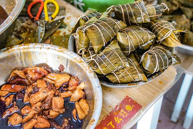 肉粽是嘉兴粽子中的翘楚,也是最能代表地方口味的一种。取肥瘦相间的猪后腿肉切成大块,用酱油、米酒等腌制浸泡一夜,等到肉充分入味后把酱汁倒出,拌入糯米,再一齐包成粽子。蒸熟以后,锅内热气已经伴着肉粽的香味夺门而出,恣意勾引着打门前经过的饥肠辘辘的行人。