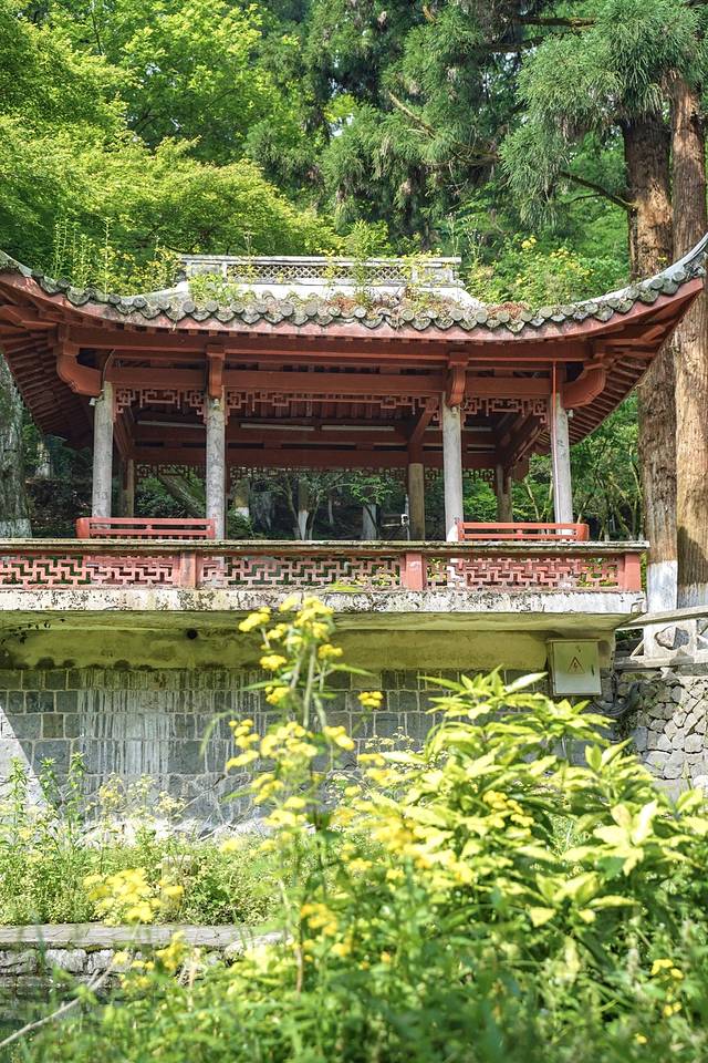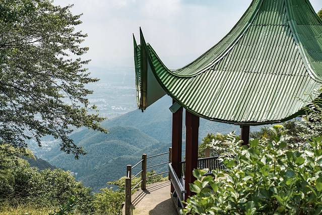 从停车点身后的岔路走下来,没几步路先看到一个气派的门楼——清凉亭,这里是抵达旭光台的检票口,过去再走几步山路,就能看到前方山尖上飞起的屋檐,那就是旭光台了。