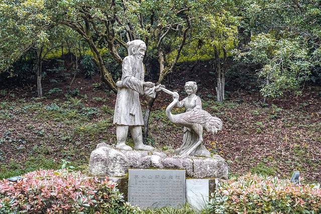围绕公园中心芦荡一周,便是开山老祖塑像、莫干山碑林、陈帅诗碑亭、鹤啄泉、鹤池等等,许多颇有文化感与传说感的景点都在这一区域,这里也被统称为“芦花荡公园”。