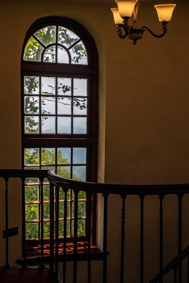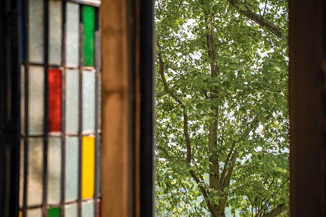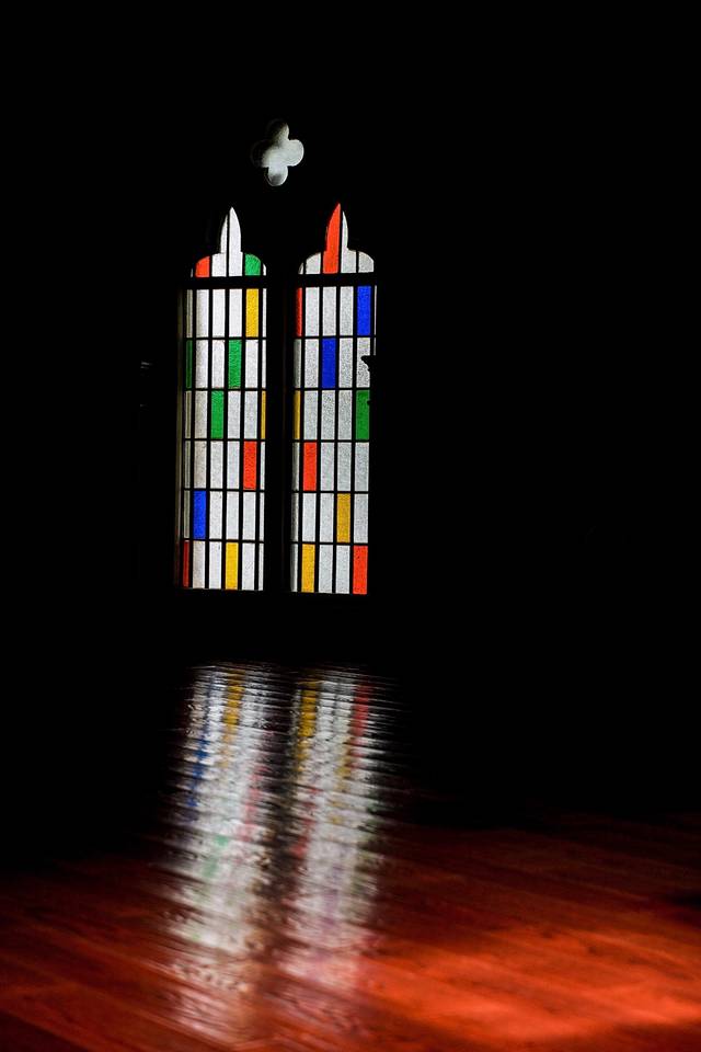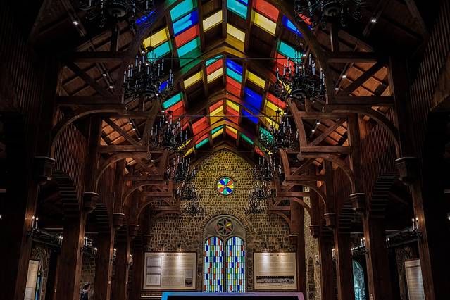 除了仿佛欧式结构的古堡,这座教堂的许多细节也都非常考究,彩绘的玻璃窗非常好看,光线透进来仿佛置身在欧洲小城。