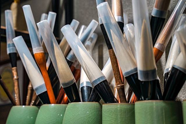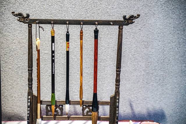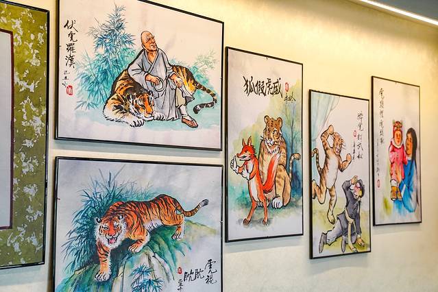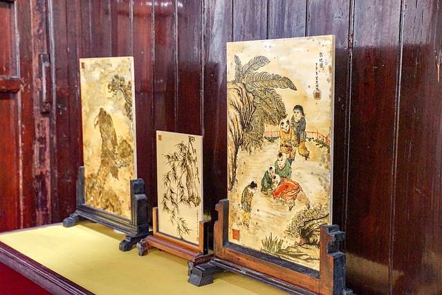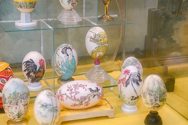 二楼分设六个小展厅,以展示当地民间艺人的手工艺术品为主。艺人作品通过书画、摄影、皮贴、竹雕、金石、编织及彩蛋画、瓷版画、卵石画、宣传漫画,还有文学艺术、提月艺术等等。细细看来发现这些艺术品的内容竟是如此丰富多彩,这座小小的古镇竟有如此深厚的艺术底蕴,也着实让人叹为观止。