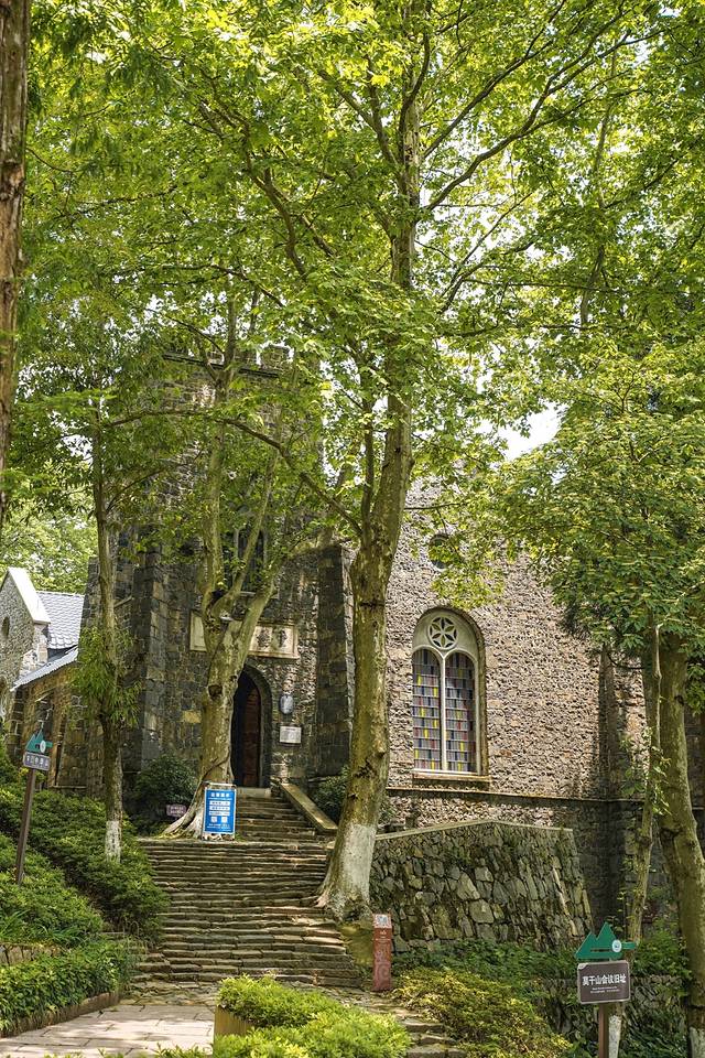 急着赶路,大坑没有足够的时间进入,于是靠近下山口的大教堂成了此行莫干山上最后一个观景点。地图上的“莫干山会议旧址”和“莫干山大教堂”其实是同一处建筑,这座中世纪城堡一样的教堂,是由美国传教士海依士于1923年所建。