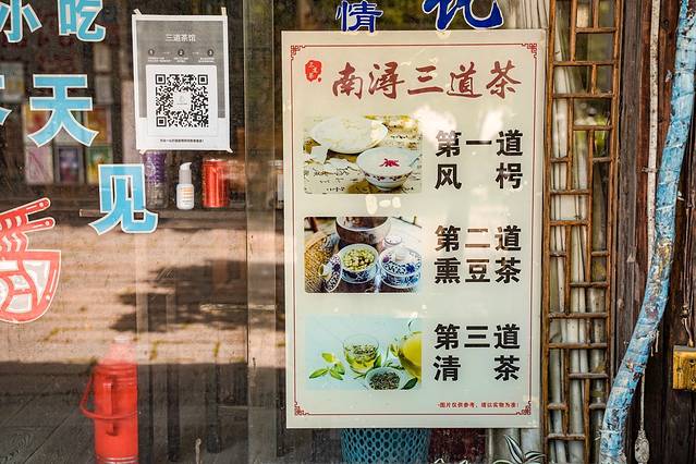 水上集市区域周围的大多数店家都属于“早茶客”里包含的商家,可以选择户外的露天茶座、某家店内的座位,或者另外付款选择在船上吃饭都可以。每家店门口都有自家的菜单,可以用手机扫码进行下单,下单时使用预约的手机号登陆,就会自动根据优惠金额进行抵扣。通常来讲,民宿客人有30元的餐食额度,足够品尝一顿丰盛的早餐,酒店客人的额度不限,适量点餐不要浪费就好。