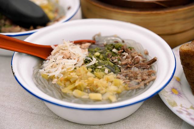 看似清淡无奇,其实最看重的是一个“鲜”字。肉的鲜、水产的鲜、笋的鲜,被豆腐皮系数都包裹在其中,在高温的作用下彼此融合,共同升华在冒着热气的汁水中。千张包的口味现在除了传统的馅料,还有鸡肉、虾肉、三鲜的,店里贴心地准备了什锦套餐可以一次品尝到。最佳的搭配,就是和粉笔粗细的粉条,一起煮成“千张包粉丝汤”,这还是我第一次见到这么粗壮又Q弹的粉丝,扎扎实实的口感让我直呼“内行”!