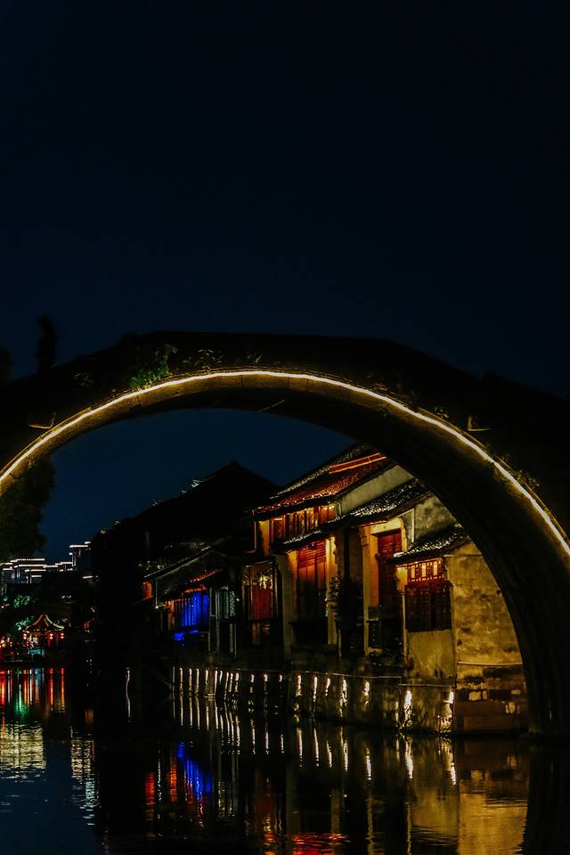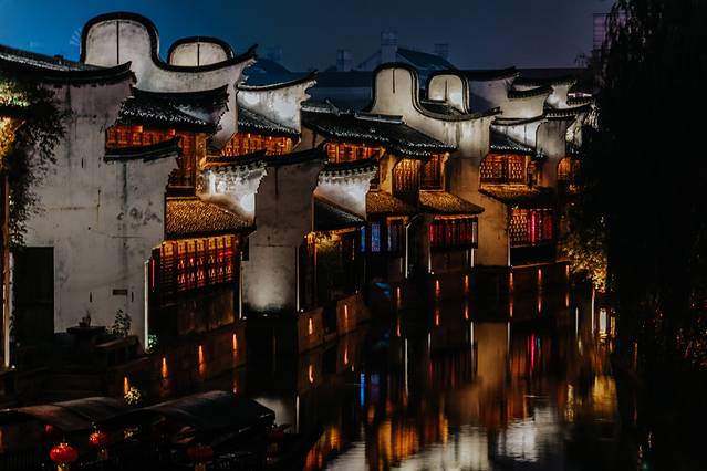 月光倾泻下来,河水倒影朦胧,白墙灰瓦的轮廓在灯光中显现。如此景致,在我心里轻轻地,撞了那么一小下。