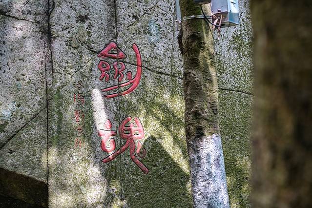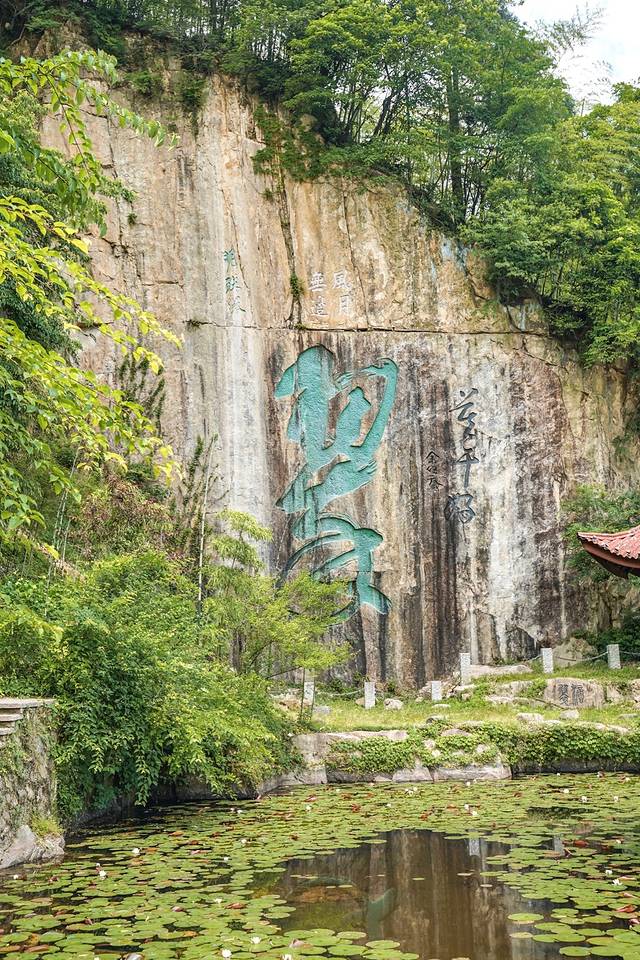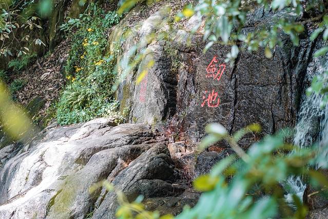 铜铸像再下行几步,就到了传说中的铸剑处——剑池。池水清澈,上有飞瀑悬空泻下,旁有亭栏磴道,上下盘旋。剑池也是莫干山摩崖题刻最集中的地方,尤其是一些近现代名人,如抗日名将马占山等的题刻,借景抒怀,充满了爱国激情。