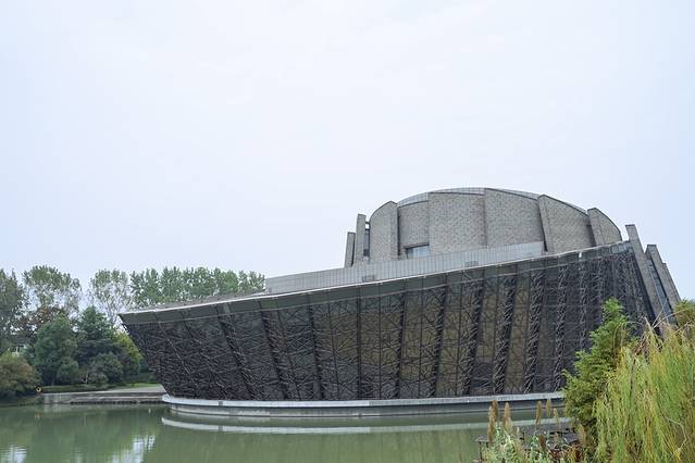 从游客中心检票入内,可以按照逆时针的方向步行游览乌镇。第一站,便是形似巨轮、伫立于水上的大剧院。在木质栈道上步行,就能从多个角度观赏这座地标性建筑。与这座建筑比肩而立的,便是乌镇景区内著名的木心美术馆。