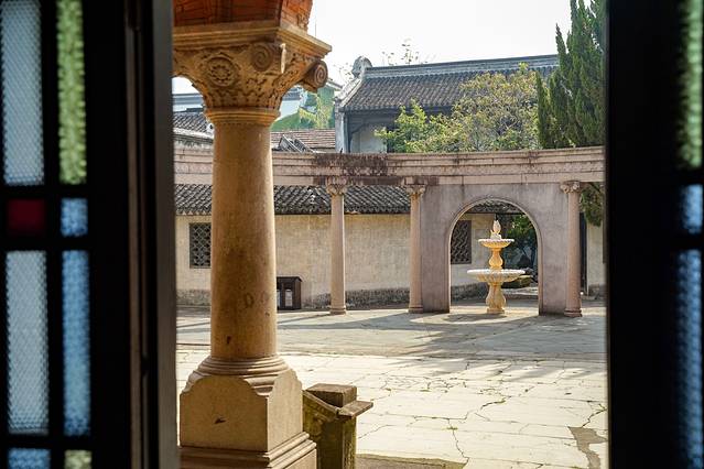 阳光从屋顶的彩色玻璃窗里透过,五彩斑斓地倾泻而下。厚厚的墙壁将正午的暑热统统隔绝在外,置身其中只觉得清凉无比。在这样一种氛围感之下,我又开始神游了。一霎时,仿佛我不是置身在浙江北部的一座山里,而是在欧洲一座中世纪小城的教堂里。
