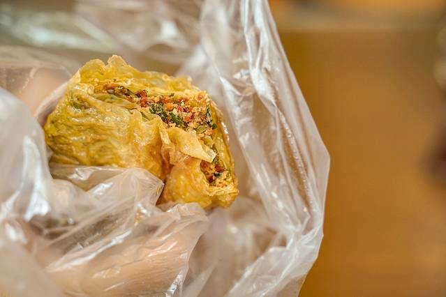 最后,终于还是没能忍住点心的诱惑,试了一下店里的“臭包”,果然不会失望!臭豆腐、辣椒加上许多种菜切碎卷进了类似素烧鹅的外皮里,一口咬下冲击感十足,味觉被拿捏得死死的。