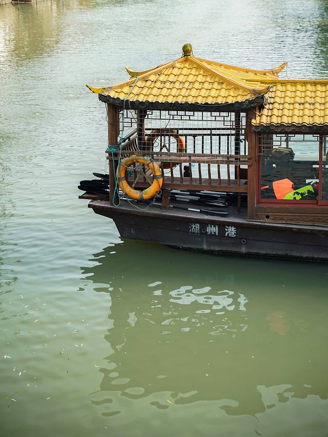 身后一片开阔的水域,是乌镇的元宝湖。游客乘船的渡口就在此处,可以将游客在这里的安渡坊码和如意桥码头来回摆渡,在摇摇晃晃的船上感受江南水乡的另一种景致。