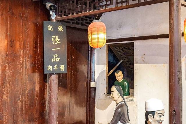 据说每逢冬天,走在古镇的街上,时不时看到几个店家门前的锅咕噜咕噜冒着热气,酱香与肉香蒸腾弥漫在空气里。尽快此时已是江南的盛夏,但也几乎可以想象,在一个冷雨凄凄的冬夜,一位外地来客被江南潮湿的阴雨教训得瑟瑟发抖,他走进古镇的一家小店,老板端上一份羊肉面,那客人吃得酣畅淋漓浑身发热,总算在热气之下重新抖擞了精神。他走出店门,空气中依旧弥漫着醉人的酱香,让这个千年古镇显得格外温暖。