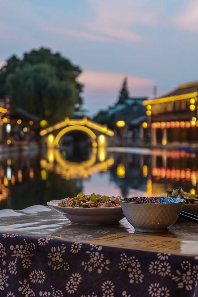 百间楼的老房子里,有许多当地人开的小餐馆,虽不及长兴馆等老字号的端庄大气历史悠久,却都有几样拿得出手的特色菜惊艳又落胃。最后选了“顾家阿公阿婆店”这样一家名字很温馨的小店,女主人贴心地帮我把餐位放在了河边。于是,伴着暮光眷恋的夕阳,我在南浔吃了一顿相当有“仪式感”的晚餐。