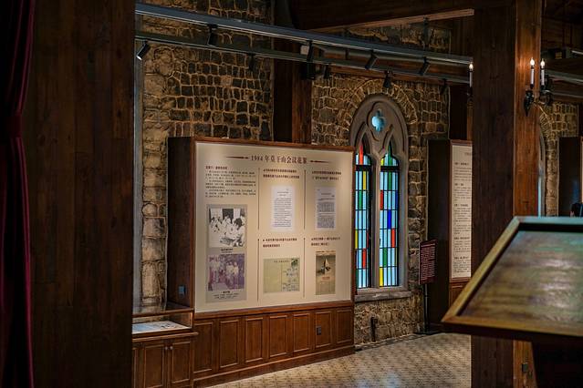 教堂内部保留的非常完好,宽敞的大厅墙壁上是关于莫干山会议的图文介绍,还可以从旁边的通道走上布道台,以第一视角观看这座雄伟教堂的内部。