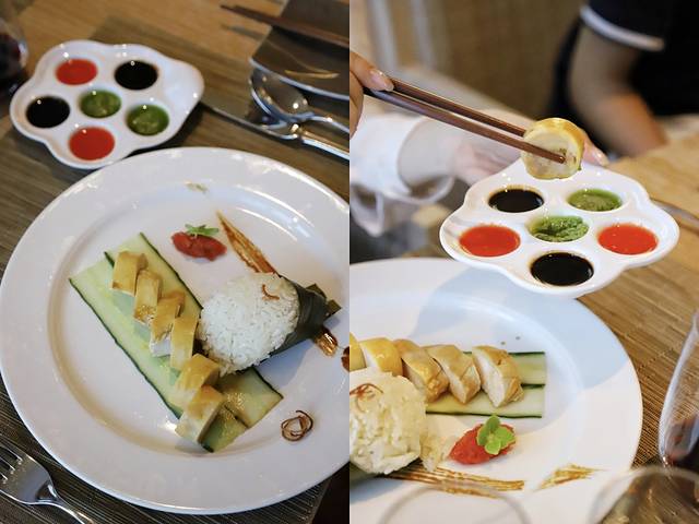 【海南鸡饭】海南鸡肉质细腻,皮儿嫩滑,配了三种酱料各有各的风味,我个人特别喜欢黑酱油,鸡油香米饭口感韧韧的非常香口,还不错。